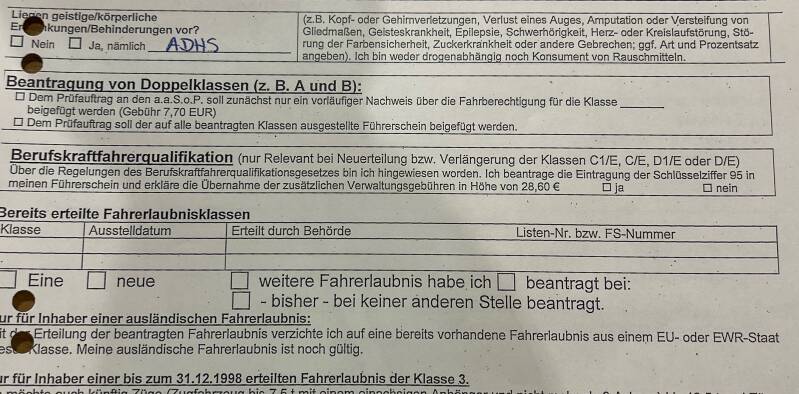 In einem aktuellen Antragsformular der Fahrerlaubnisbehörde wird unter der Frage nach „geistigen/körperlichen Einschränkungen“ in der Erläuterung unter anderem der Begriff „Geisteskrankheit“ verwendet. ADHS wird im selben Abfragefeld eingetragen.